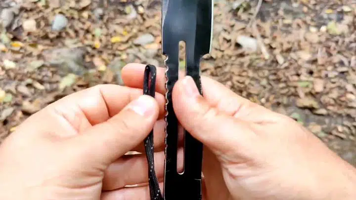 - Place your survival or bushcraft knife above the paracord center point, then bring the right and left rope ends to the top.