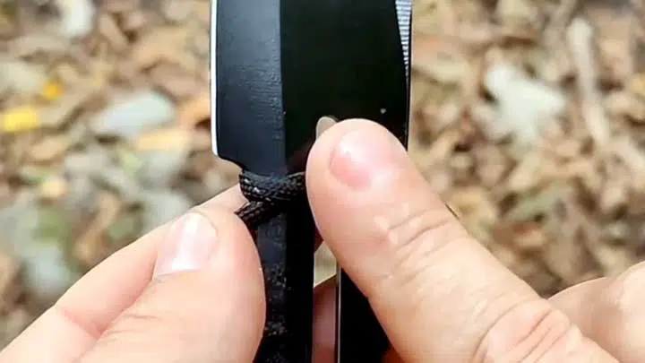 - Use your thumb to stretch the rope on the surface and keep it in place. Leave the tag end of the loop exposed slightly on the blade end of the handle.