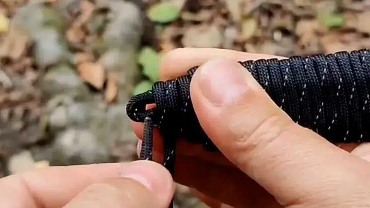 - On the other end, if the lanyard hole is not big enough, lock the cord using a knot. Otherwise, create a slot on the lanyard hole using the extra rope. Push this cord through the opening, then tighten everything to secure the paracord handle.